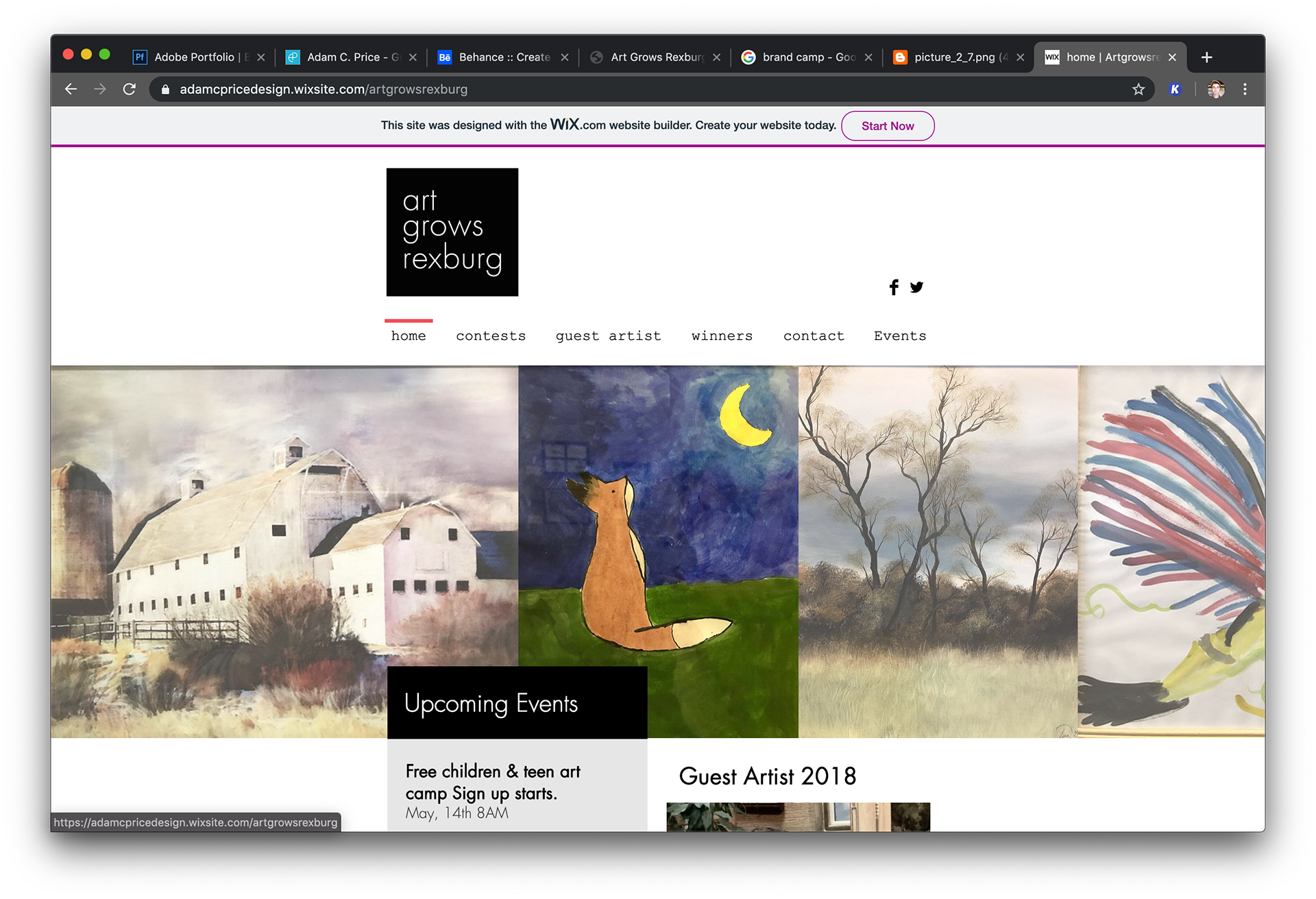 I also put together a mock website concept for the group (https://adamcpricedesign.wixsite.com/artgrowsrexburg -Left) with the various colors of logo on separate pages. Though they went a different direction (https://artgrowsrexburg.org - Right), I did enjoy the color-shifting of the logo that was coded into the top left corner of the final website.