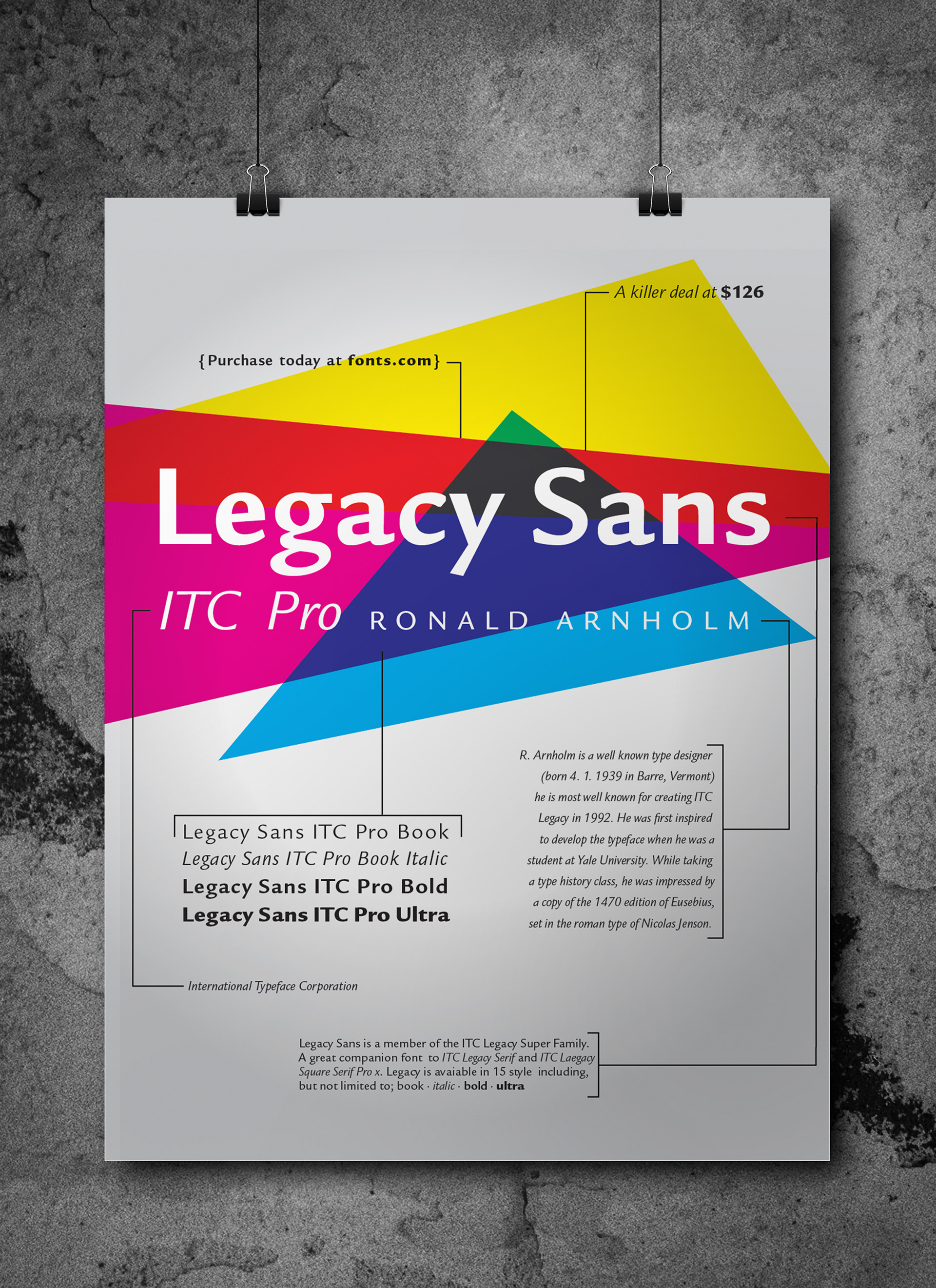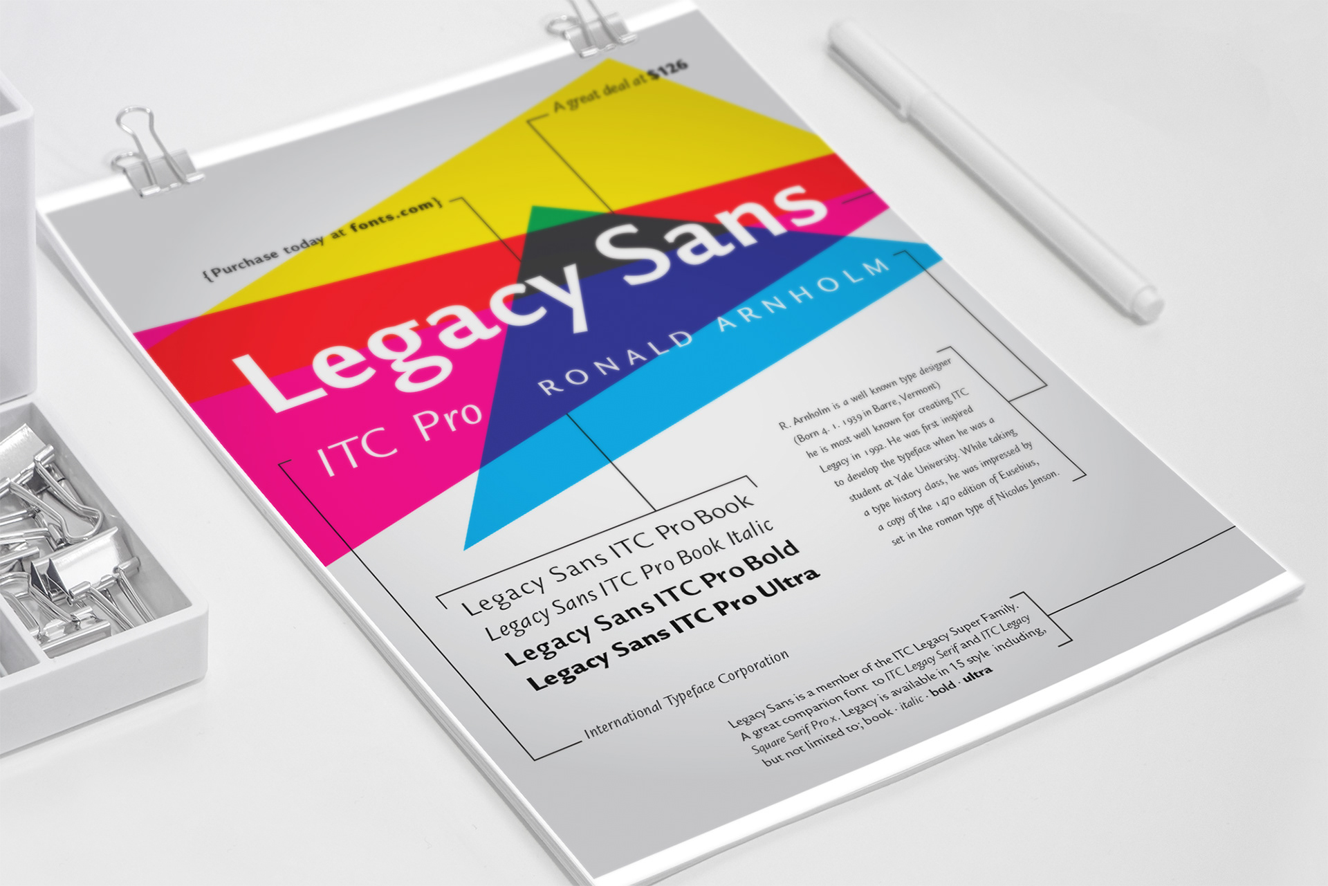 A font poster intended for marketing the font to other designers. The chosen font was Legacy Sans ITC Pro, providing 4 weight variations for Art 230 - Intro to Typography.